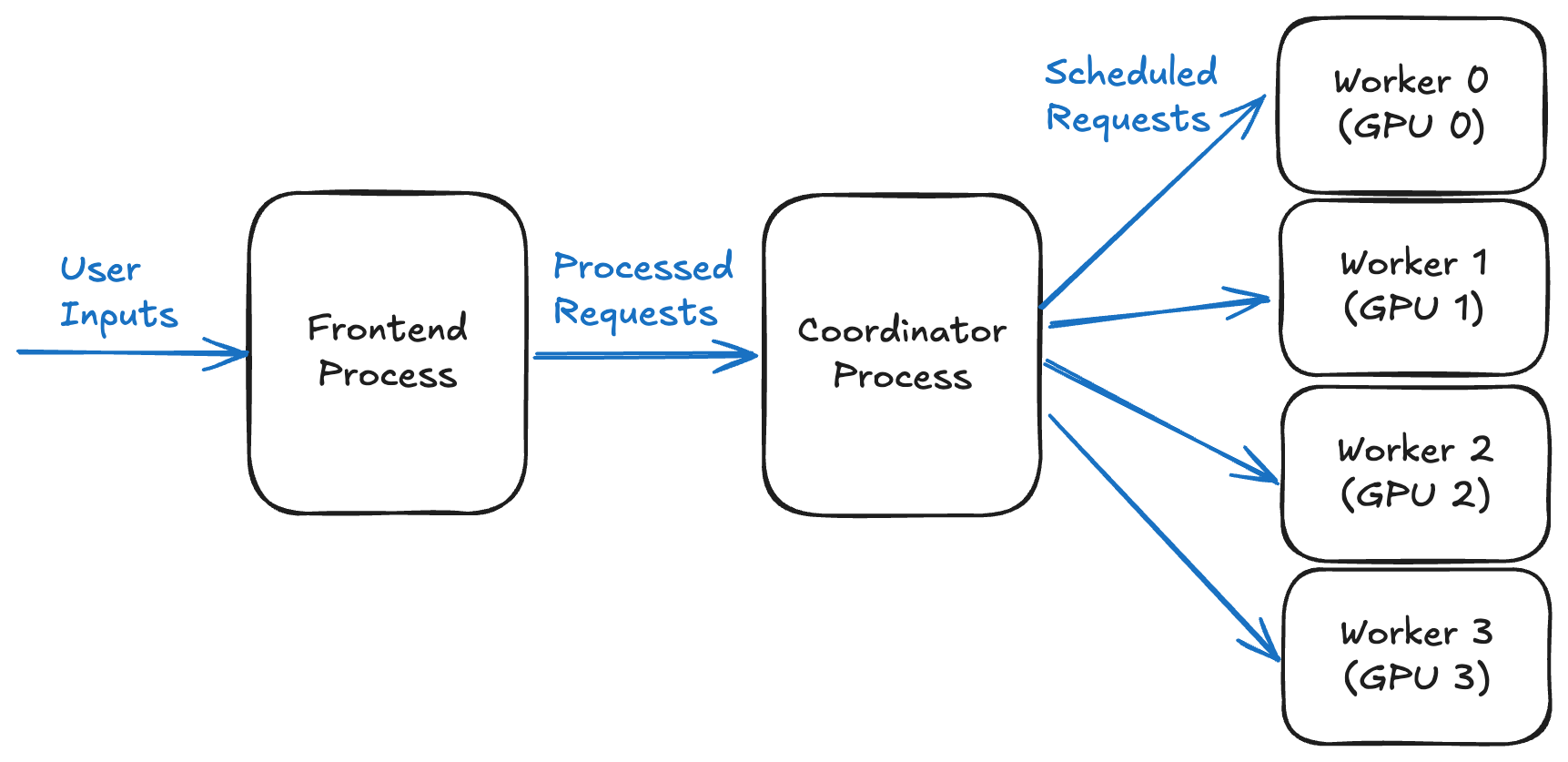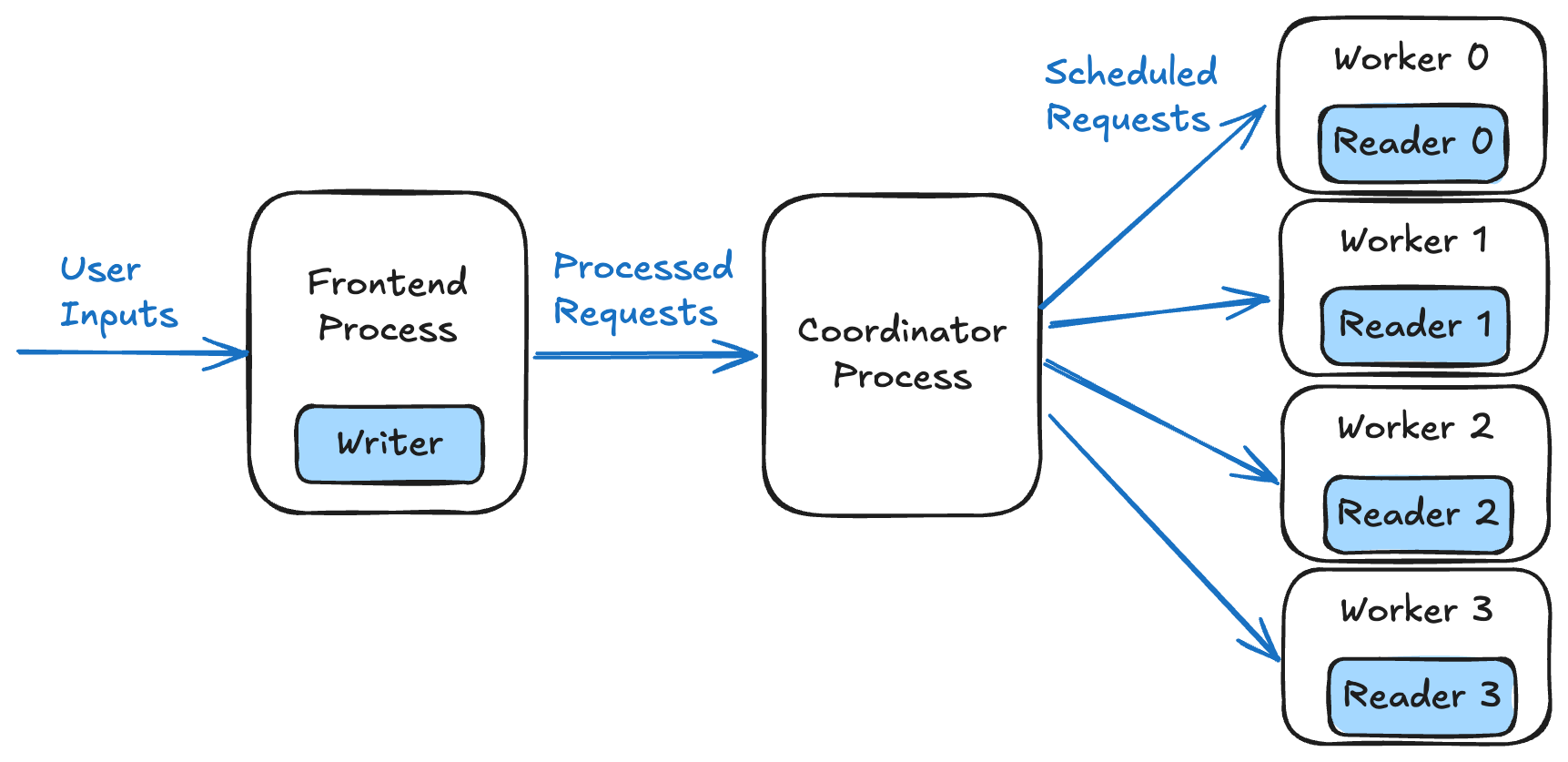 The diagram below shows how processes coordinate in an LLM inference system with four GPUs. The front-end sends input data to the coordinator, which then routes it to four workers, one per GPU, to perform inference.