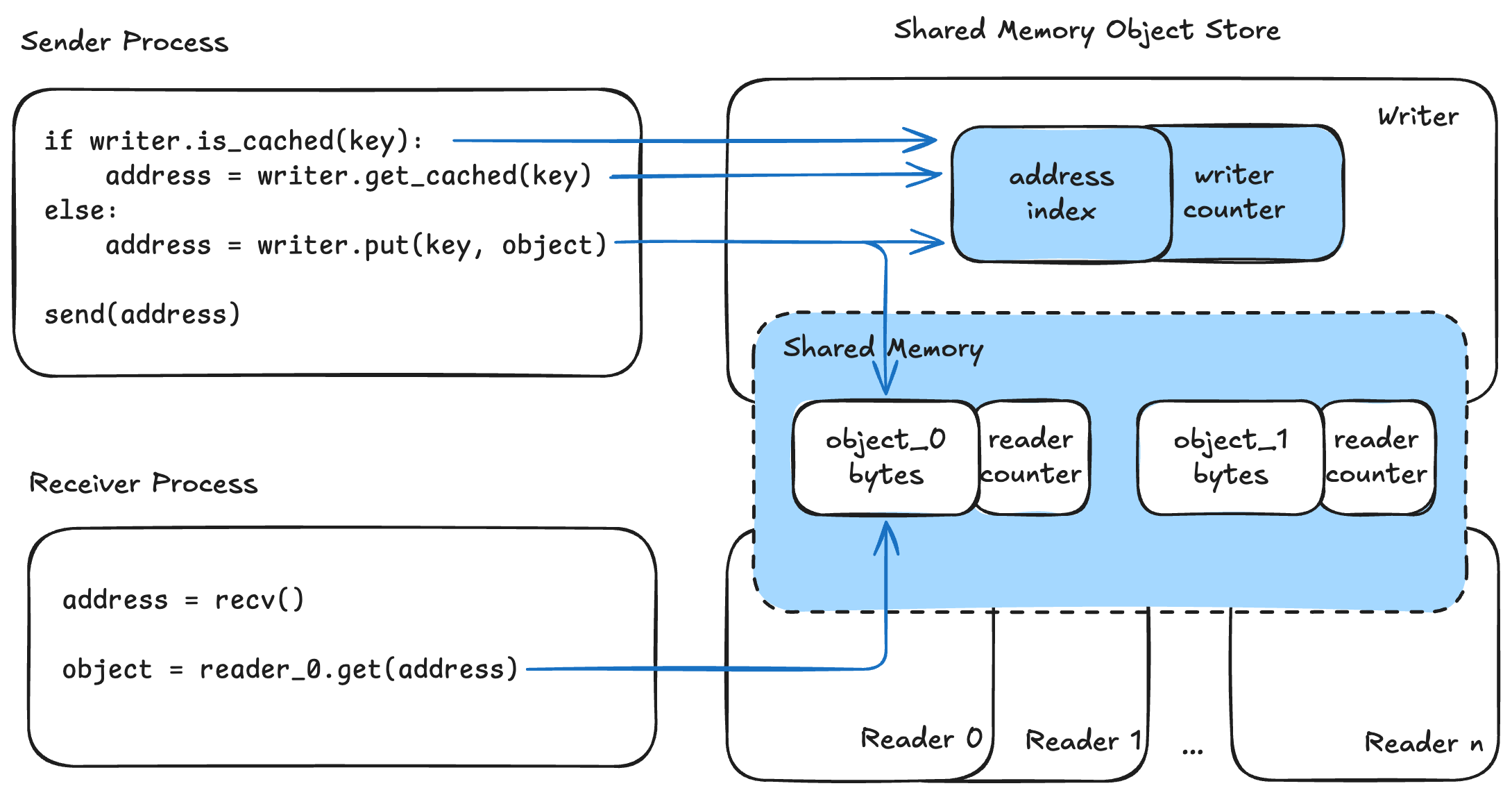 The diagram below shows IPC caching using a Shared-Memory Object Store. The sender process maintains a writer instance, while each receiver process has a corresponding reader instance.